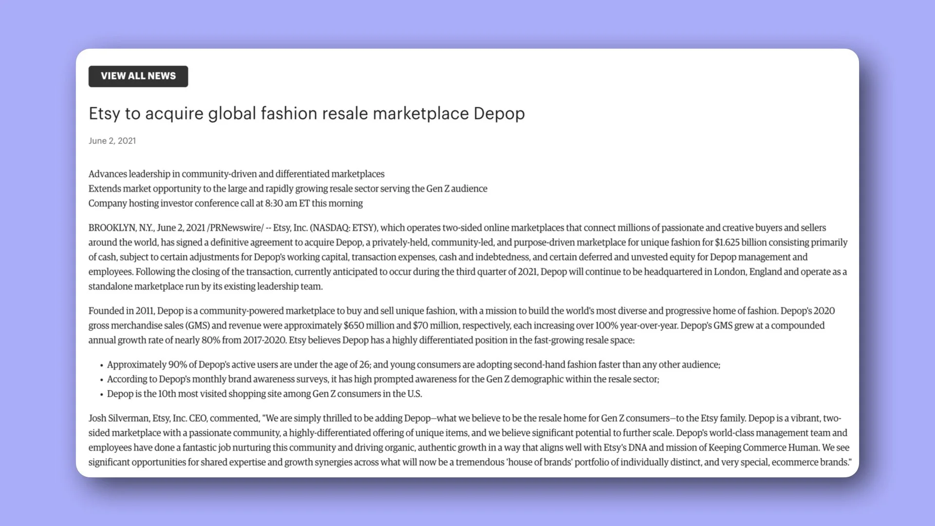 In 2021, Etsy acquired Depop, a UK-based secondhand shopping platform, for $1.6 billion — a striking 23x Depop's 2020 revenue of $70 million.